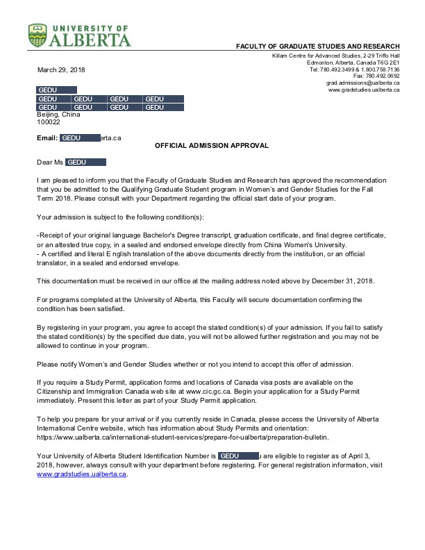 馮同學 中華女子學院, 雙非院校,申請到世界排名前100的阿爾伯塔大學。