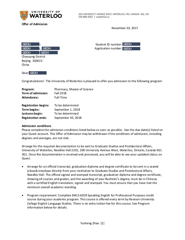 全獎,國內醫學專業,提前規劃申請到加拿大 滑鐵盧大學全獎。